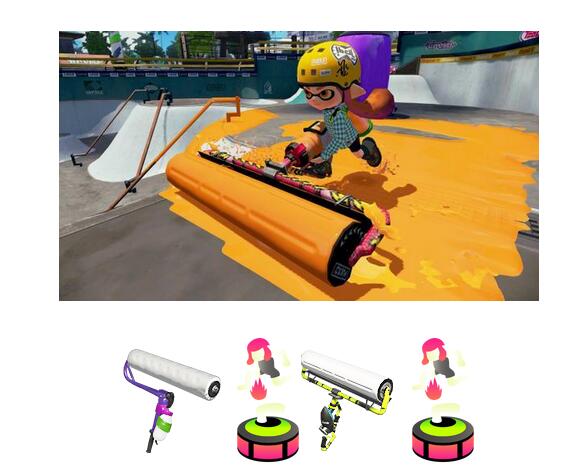 롤러는 휘두르거나 굴려서 잉크를 뿌리는 무기로, ZR 버튼을 한 번 누르면 한 번 공격하는 형태입니다.